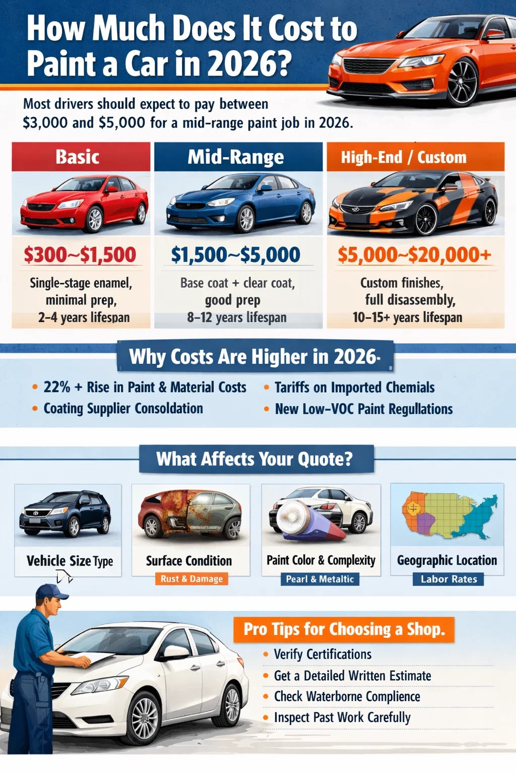 The short answer for 2026: most drivers should expect to pay between $3,000 and $5,000 for a solid mid-range paint job, with budget options starting around $300–$1,000 and premium or custom work reaching $10,000 to $20,000 or more. That mid-range benchmark has shifted upward compared to just a few years ago. Paint and material costs have climbed more than 22% since 2022, driven by inflation, tariffs on imported chemical compounds, EPA regulatory changes, and ongoing consolidation among the major coating suppliers. All of those pressures are continuing in 2026—meaning quotes you received even 18 months ago are likely no longer accurate.