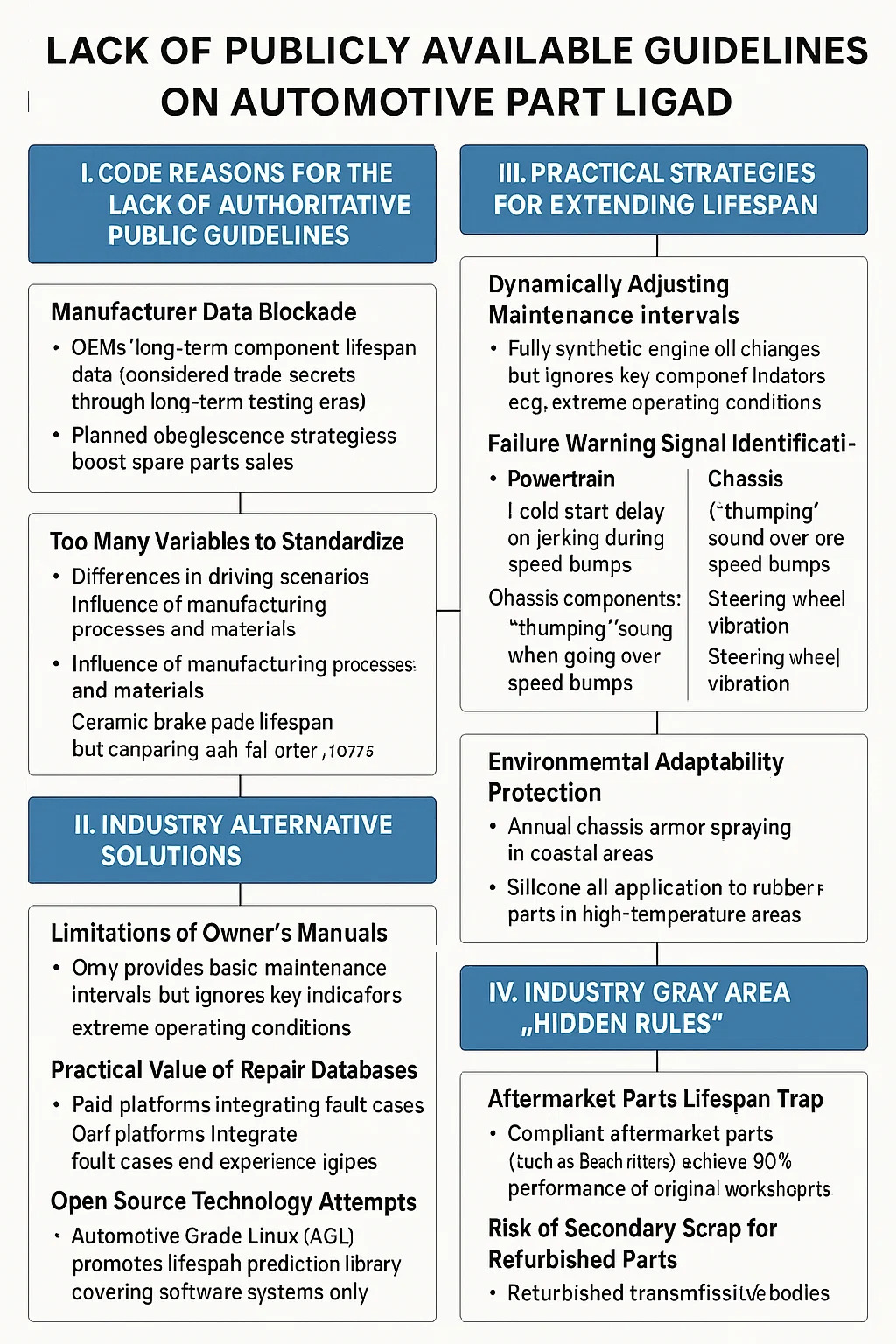 • Manufacturer Data Blockade: OEMs' accumulated component lifespan data (such as timing belt breakage thresholds and bearing wear curves) through long-term testing are considered trade secrets and are not publicly disclosed.