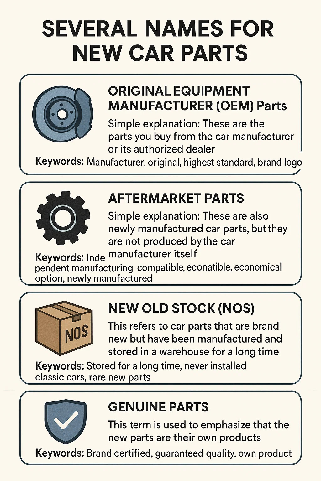 Brand new car parts have several common names, which differ slightly depending on their source and nature.