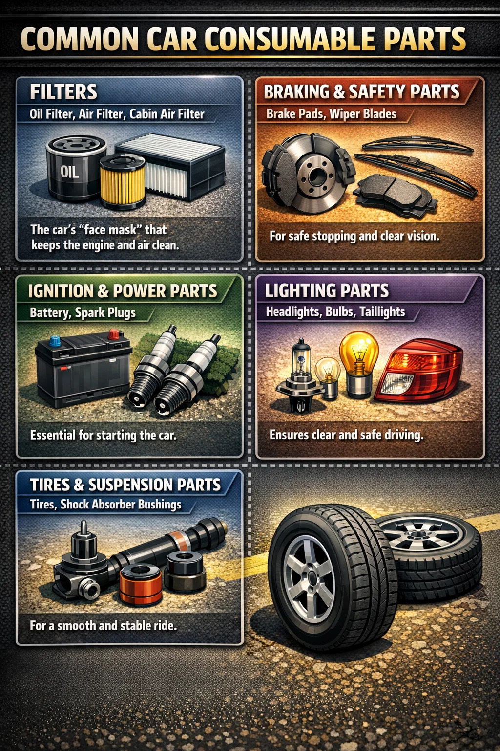 In the world of automobiles, some parts wear out quickly and are in high demand, making them easily available at any auto parts store or repair shop. These car parts are commonly referred to as "consumable parts" or "commonly used parts."